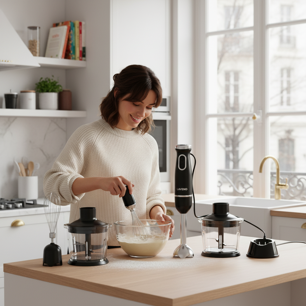 Le LAVENO Atelier Pro transforme votre cuisine. Ce système de mixage 3-en-1 sans fil est la solution parfaite pour ceux qui aiment cuisiner mais manquent d’espace. Mixez, hachez et fouettez avec un seul appareil puissant et élégant, conçu pour s’adapter au style de vie urbain et créatif.